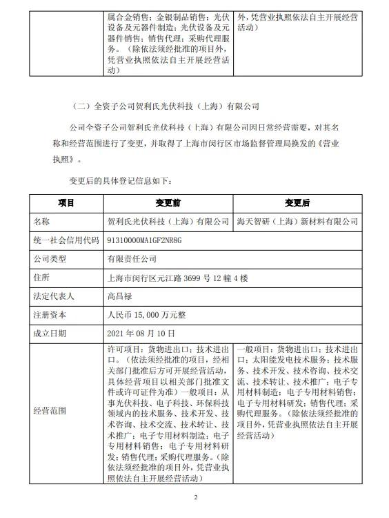 因经营发展的需要,公司全资子公司贺利氏光伏(上海)有限公司因日常经营需要,对其名称和经营范围进行了变更,并取得了上海市闵行区市场监督管理局换发的《营业执照》。