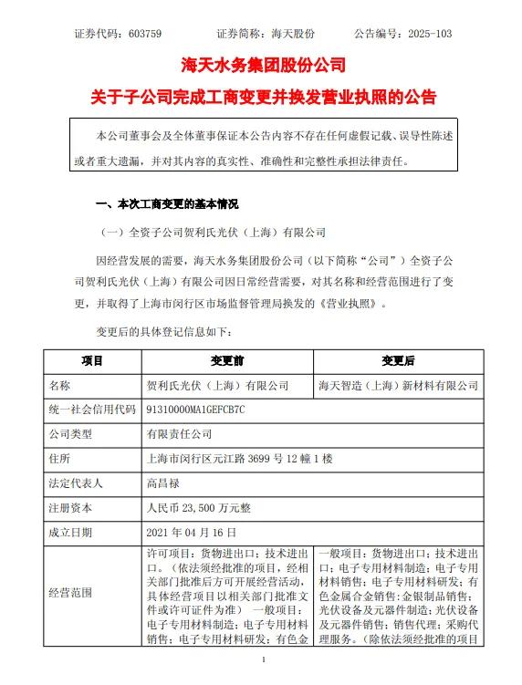 具体看,贺利氏光伏(上海)有限公司变更为海天智造(上海)新材料有限公司,法定代表人为高昌禄。