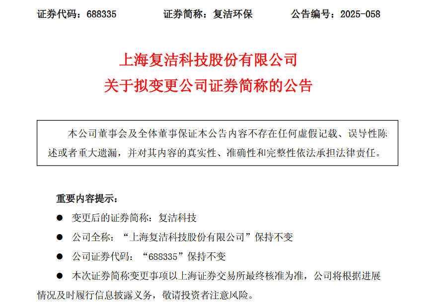 为了能够更精准反映公司当下的业务实际与技术创新特质,与公司长远战略规划相契合,充分展现公司坚持科技创新引领发展新质生产力的坚定决心,更准确、全面地反映公司在资本市场的价值定位与发展前景,公司拟将现有的证券简称“复洁环保”变更为“复洁科技”,公司全称和证券代码保持不变。