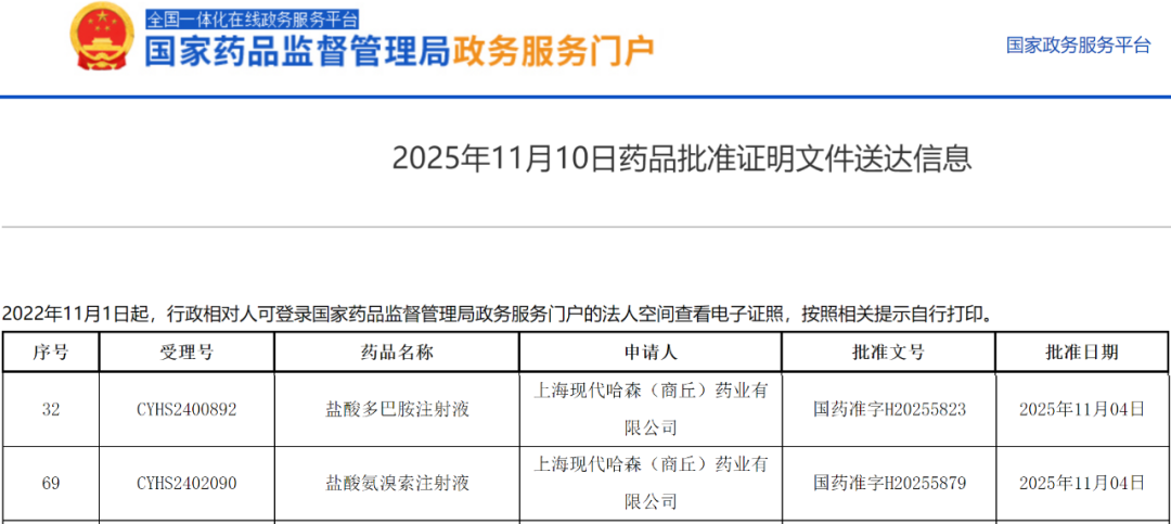 近日,国家药监局官网显示,国药现代申报的2款仿制药盐酸多巴胺注射液、盐酸氨溴索注射液同日获批生产并视同过评,均为注射剂,其中盐酸氨溴索注射液2024年在中国三大终端六大市场(统计范围详见本文末)的销售额超过10亿元。