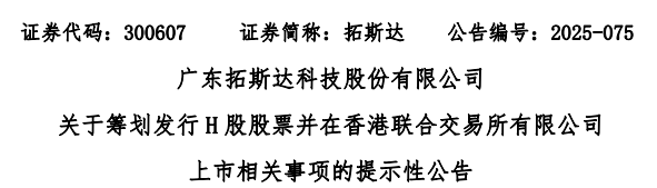 来自广东东莞的A股上市公司拓斯达(300607.SZ)发布公告称,为深化公司全球化发展战略,提升品牌影响力与核心竞争力,同时更好利用国际资本市场,拓展多元化融资渠道,正在筹划发行境外股份(H股)并在港交所上市事宜。