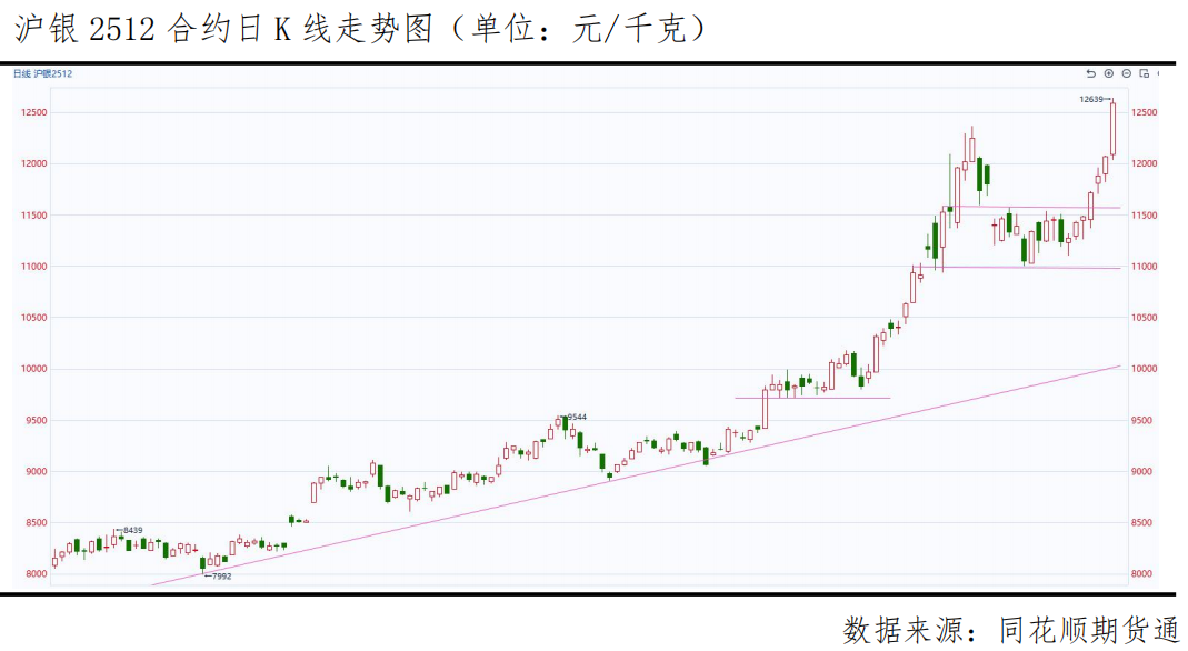 在经历两周左右的震荡整理后,本周白银重拾涨势,截至今日(11月13日)收盘,内盘白银主力合约AG2512报收12588元/千克,涨幅5.48%。日K线连续7个交易日收出阳线,并创历史新高。那么是什么原因导致白银期价大幅上扬,后市将如何运行?