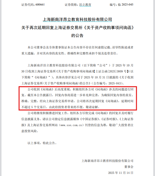13日盘后,昂立教育发布公告称,将再次延期回复上交所就其拟溢价收购亏损公司事项下发的问询函。这已是公司自10月30日收到问询函后,第二次宣布推迟回复。