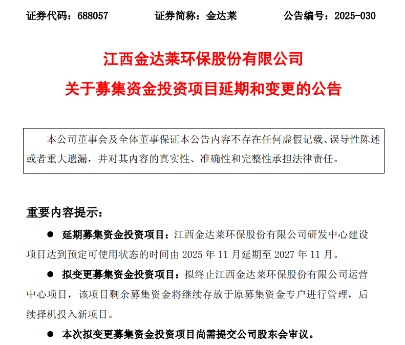 11月13日,金达莱发布公告,延期募集资金投资项目金达莱研发中心建设,项目达到预定可使用状态的时间由2025年11月延期至2027年11月。同时,拟终止金达莱运营中心项目,项目剩余募集资金将继续存放于原募集资金专户进行管理,后续择机投入新项目。