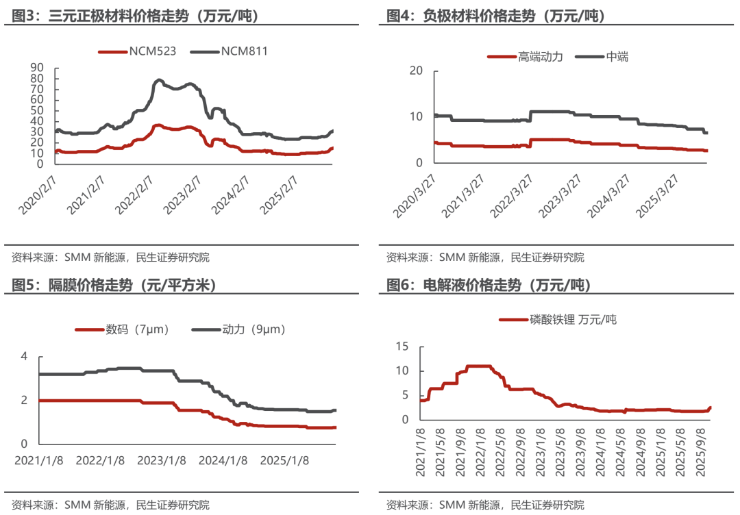 从市场份额来看,宁德时代市占率领跑众龙头。2025年1-9月,宁德时代市占率36.6%,仍是唯一占据35%以上市场份额的电池供应商;比亚迪市占率17.9%,同比提升1.4pcts;第三名LG新能源市占率9.8%;中创新航的市占率4.8%;SKOn和松下的市占率分别为4.2%和4.1%;国轩高科市占率3.7%;三星SDI市占率2.8%;亿纬锂能市占率2.7%;蜂巢能源市占率2.5%。