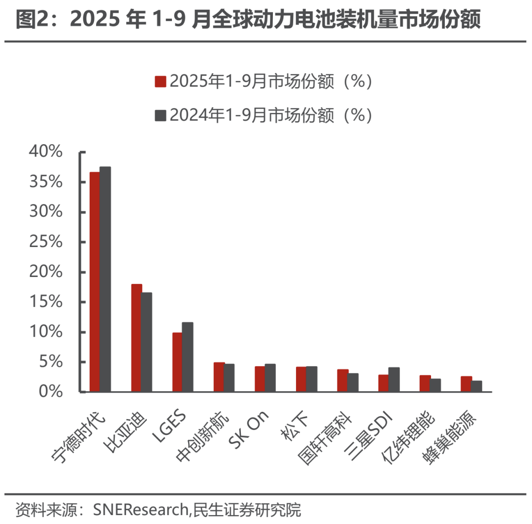据SNEResearch披露的数据显示,2025年1-9月,全球动力电池装车量达811.7GWh,同比增长34.7%。2025年1-9月宁德时代和比亚迪合计市场份额达54.5%,在全球市场依旧领先。LGES排名仍在第三,但增速仅14.7%,市场份额仅9.8%。据中国汽车动力电池产业创新联盟发布的数据,1-9月,我国动力电池累计装车量493.9GWh,累计同比增长42.5%。其中,宁德时代和比亚迪合计占据了超过国内65%的市场份额。