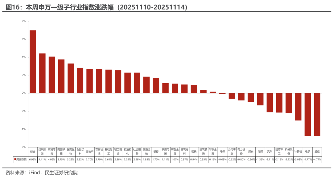 电力设备与新能源板块:本周下跌0.80%,涨跌幅排名第23,弱于上证指数。本周锂电池指数涨幅最大,工控自动化跌幅最大。锂电池指数上涨1.29%,风力发电指数上涨0.07%,储能指数下跌0.02%,新能源汽车指数下跌0.82%,太阳能指数下跌3.05%,核电指数下跌4.48%,工控自动化下跌5.08%。