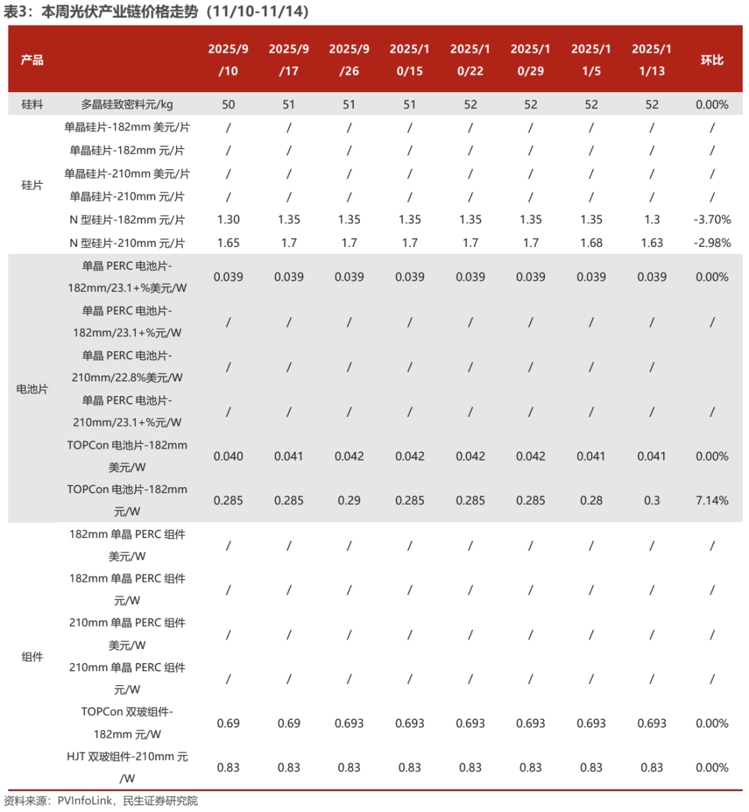 电池片:根据SMM统计,十月全球电池片实际产出约60.3GW,十一月预计排产量约58.7GW,环比下降约3%。减产主要来自一体化厂家,并且主要减少210N尺寸排产。按技术比例区分,十月份TOPCon预计排产占比约88%,PERC与BC分别为5%与6%,HJT则约1%。
