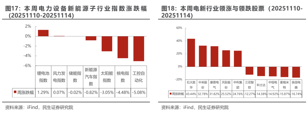 板块子行业:本周锂电池指数涨幅最大,工控自动化跌幅最大。锂电池指数上涨1.29%,风力发电指数上涨0.07%,储能指数下跌0.02%,新能源汽车指数下跌0.82%,太阳能指数下跌3.05%,核电指数下跌4.48%,工控自动化下跌5.08%。