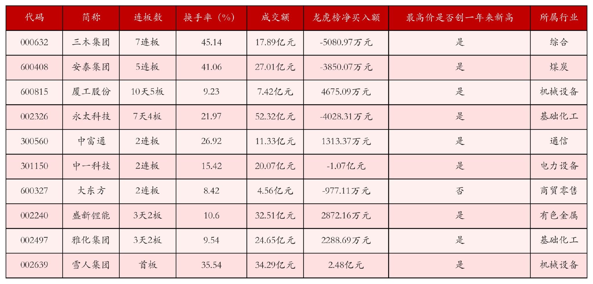 截至11月17日收盘,上证综指下跌0.46%,收于3972.03点,深证成指下跌0.11%,收于13202.0点,创业板指下跌0.2%,收于3105.2点。今日沪深两市A股共计100只涨停,综合当前连板数以及当日龙虎榜数据,其中较为强势的前三只个股分别为:三木集团(000632)、安泰集团(600408)与厦工股份(600815)。今日强势个股前10位具体数据见下表: