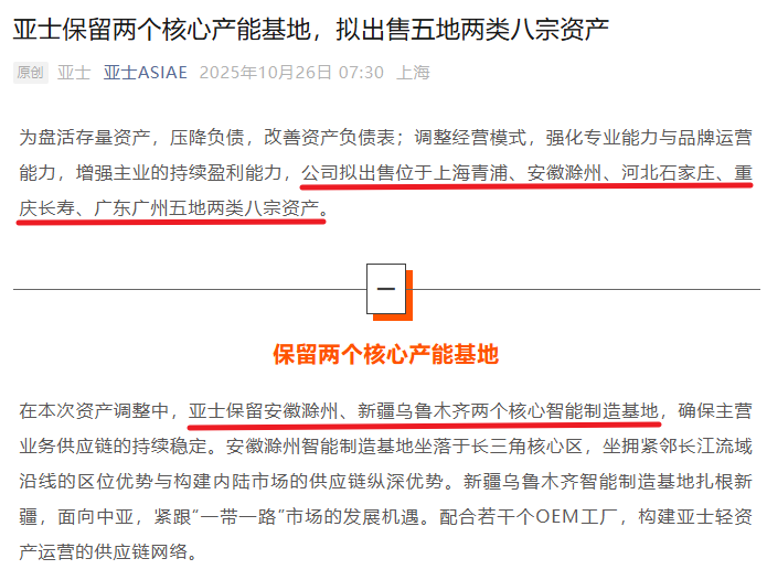 回溯亚士的资产处置进程,10月23日的初步公告披露拟出售上海、滁州、重庆等五地共八宗资产,涵盖工业用地、厂房及附属设备。10月26日的细化公告进一步明确“保留安徽滁州、新疆乌鲁木齐两大核心智能制造基地”的前提,将待售资产划分为“非生产性投资性资产”与“生产性资产”两类,为后续处置划定框架。截至11月14日,亚士已明确出售的生产性资产对应产能,按核心产品权重折算后,占拟出售生产性资产总产能的比例约达62.9%,涉及涂料、防水、保温装饰三大业务板块的非核心产能。这些产线曾承载着亚士创能“500公里半径本地化供应”的战略野心。