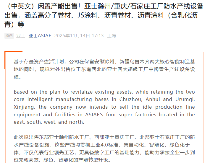 慧正资讯,近期,亚士创能密集披露资产出售计划,在2025年10月至11月的21天内四次公告“卖产”。在11月8日披露保温装饰一体化成品板生产线出售计划后,11月14日亚士创能发布最新资产出售公告,宣布拟出售分布于滁州、重庆、石家庄三地工厂的核心防水产线设备。这家曾实现年收入47亿元的企业,如今以“断臂求生”的姿态处置优质资产,既折射出自身的经营困局,更揭开了防水行业在周期调整中的生存挑战,其背后的逻辑与启示值得全行业深思。