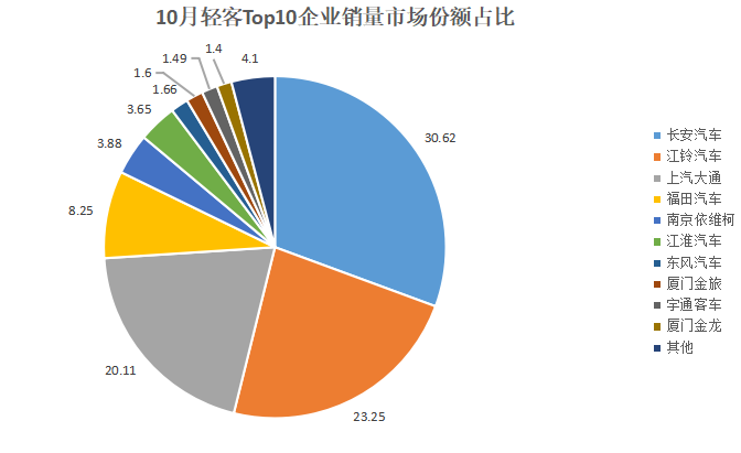 接下来看排名情况,与9月相比,10月轻客Top10排名发生了较大变化。其中,排名上升的企业有2家:江铃汽车由上月第三升至本月第二,东风汽车由上月第十升至本月第七。排名下降的企业有4家:上汽大通由上月第二降至本月第三,厦门金旅由上月第七降至本月第八,宇通客车由上月第八降至本月第九,厦门金龙由上月第九降至本月第十。另外,排名第一的长安汽车、排名第四至第六的福田汽车、南京依维柯、江淮汽车位次没有发生变化。