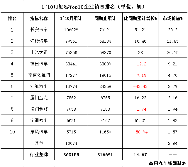 从中国汽车工业协会(以下简称“中汽协”)最新发布的产销数据来看,10月,轻客市场销量虽然回落至4万辆以内,但是保持在了月度销量的中高位;同比依然有近20%的增幅,整体表现虽然不及“金九”但也称得上“银十”。