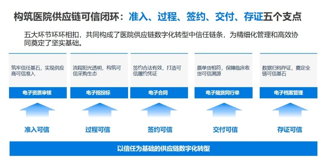 对此,基于多年医疗领域数字信任建设实践,数字认证提出 “合规化、规范化、无纸化、数智化”四化建设思路。同时以数字信任为基础,以可信身份准入为抓手,在电子资质审核、电子招投标、电子合同签署、电子随货同行单、可信电子档案归档五个关键环节推进实践,助力医院构建全链路高效协同的供应链管理体系。