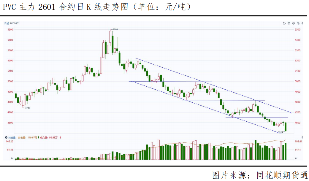 近日,PVC期货市场表现持续疲软,价格不断下探新低。截至11月18日收盘,PVC主力合约下跌1.46%,报收4520元/吨,刷新9年新低。