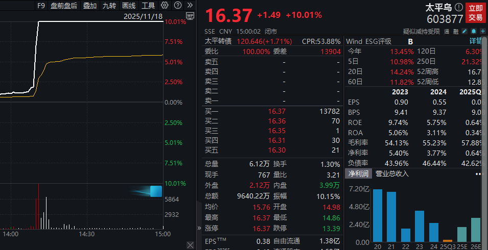 18日午后,太平鸟(603877)股价上演直线拉升,用时不到2分钟就冲上涨停。这也是该股年内首个涨停板。