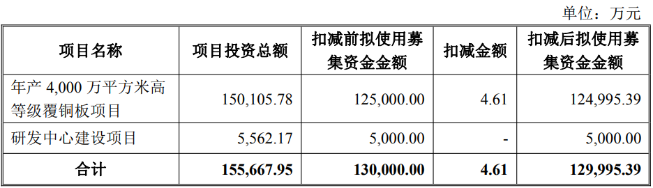 预案显示,年产4000万平方米高等级覆铜板项目总投资15.01亿元,拟使用募集资金12.5亿元。该项目重点布局高频高速覆铜板、耐高温特种覆铜板、高Tg覆铜板及无卤无铅FR-4等高性能、特殊性能产品线,同步配置部分产能用于通用型FR-4覆铜板生产。