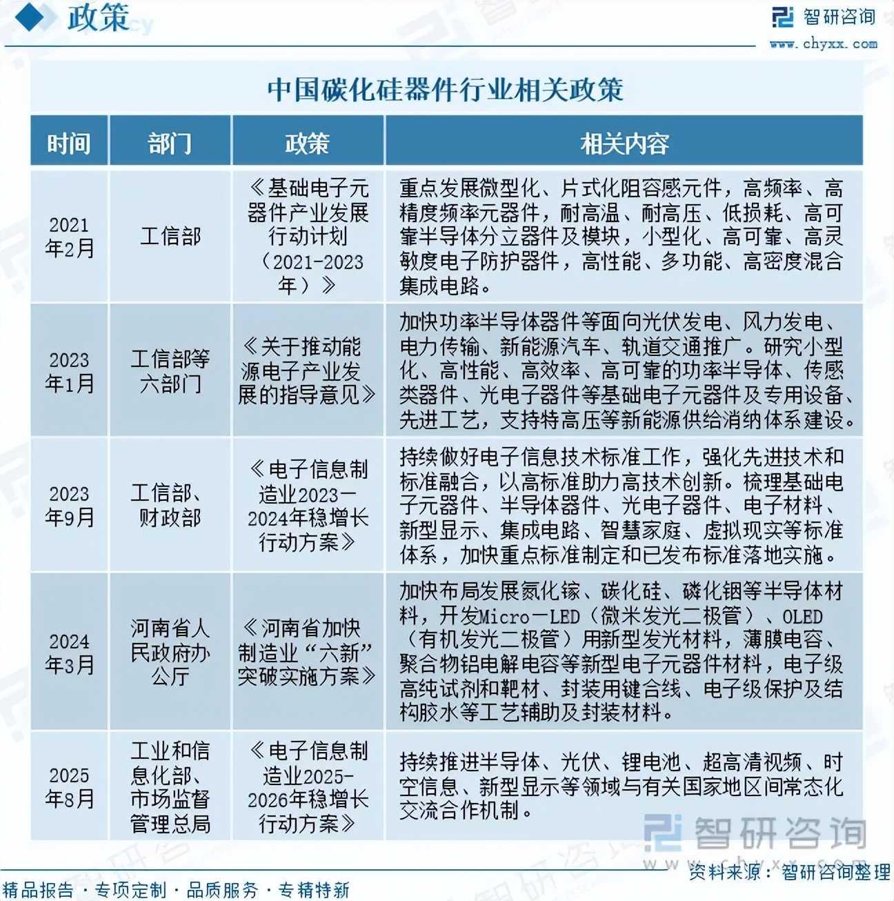 近年来,中国碳化硅器件行业受到各级政府的高度重视和国家产业政策的重点支持。国家陆续出台了多项政策,鼓励碳化硅器件产业发展与创新。例如,2024年3月,河南省人民政府办公厅印发《河南省加快制造业“六新”突破实施方案》,加快布局发展氮化镓、碳化硅、磷化铟等半导体材料,开发Micro—LED(微米发光二极管)、OLED(有机发光二极管)用新型发光材料,薄膜电容、聚合物铝电解电容等新型电子元器件材料,电子级高纯试剂和靶材、封装用键合线、电子级保护及结构胶水等工艺辅助及封装材料。2025年8月,工业和信息化部、市场监督管理总局印发《电子信息制造业2025-2026年稳增长行动方案》,持续推进半导体、光伏、锂电池、超高清视频、时空信息、新型显示等领域与有关国家地区间常态化交流合作机制。