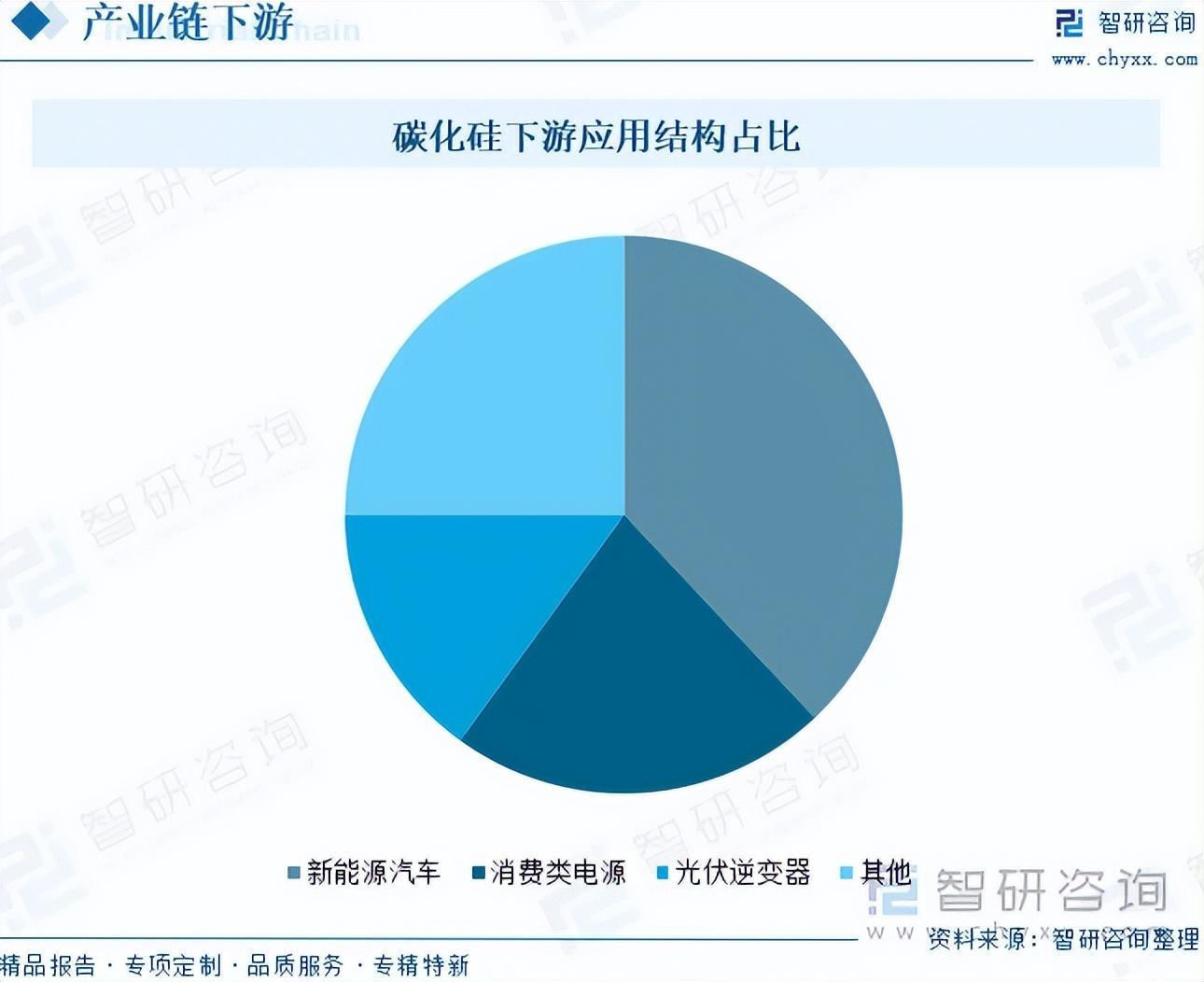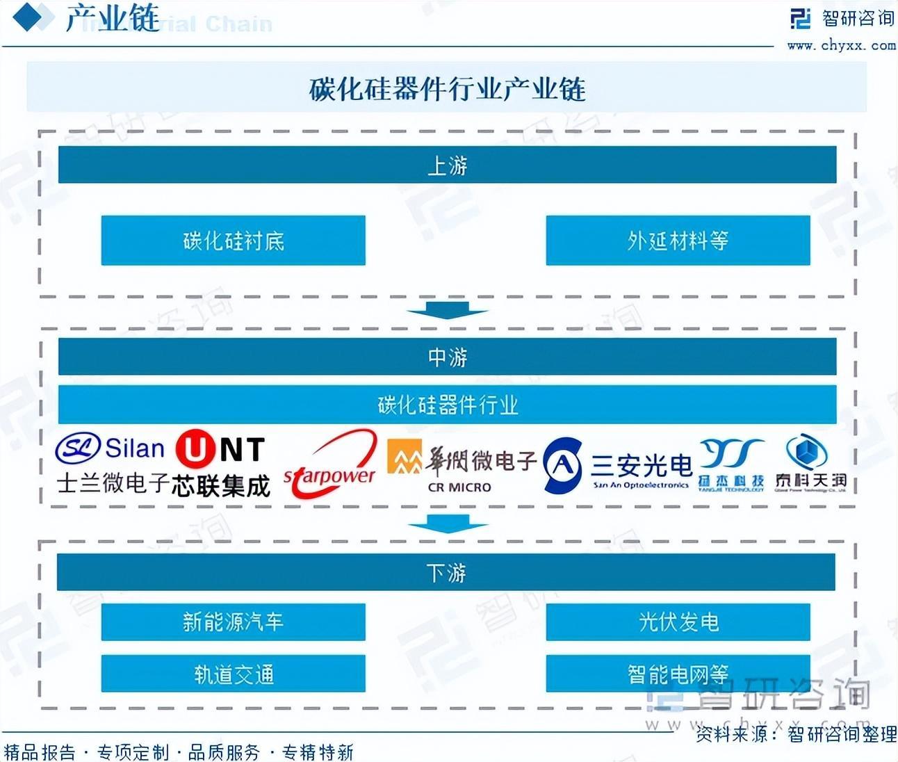 碳化硅器件产业链上游为原材料和零部件,主要包括碳化硅衬底、外延材料等。产业链中游为碳化硅器件的生产制造环节。产业链下游为碳化硅的应用领域,包括新能源汽车、光伏发电、轨道交通、智能电网等。
