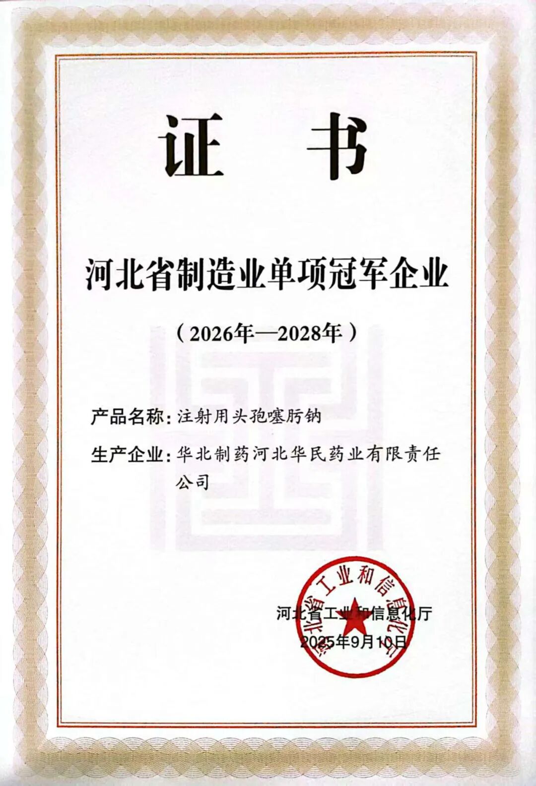 近日,华民公司凭借注射用头孢噻肟钠产品荣获河北省工业和信息化厅评定颁发的“制造业单项冠军企业”称号。