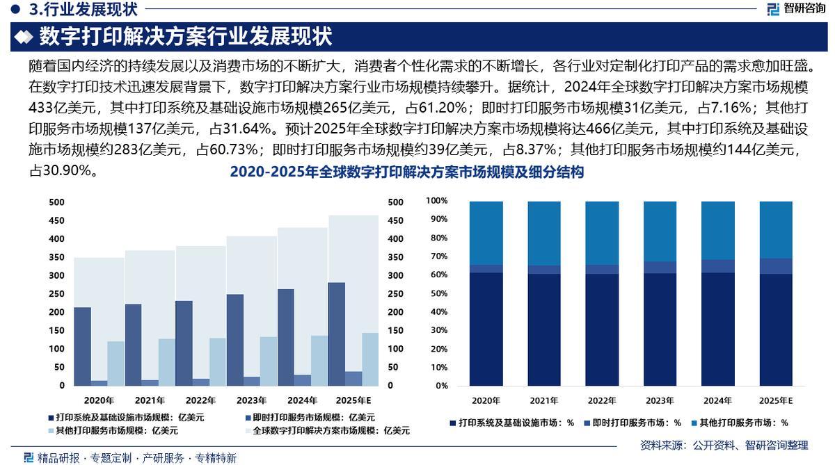 数字打印解决方案是利用计算机技术、数字打印设备及相关软件,通过数字化生产流程(包括硬件、软件和管理系统),实现按需、可变、高效、高质量的打印输出,并能够与客户的业务流程无缝集成的一站式服务与技术支持体系,涵盖了从设备、软件到材料的整体解决方案。在数字打印技术迅速发展背景下,数字打印解决方案行业市场规模持续攀升。2024年全球数字打印解决方案市场规模433亿美元,其中打印系统及基础设施市场规模265亿美元,占61.20%;即时打印服务市场规模31亿美元,占7.16%;其他打印服务市场规模137亿美元,占31.64%。预计2025年全球数字打印解决方案市场规模将达466亿美元,其中打印系统及基础设施市场规模约283亿美元,占60.73%;即时打印服务市场规模约39亿美元,占8.37%;其他打印服务市场规模约144亿美元,占30.90%。