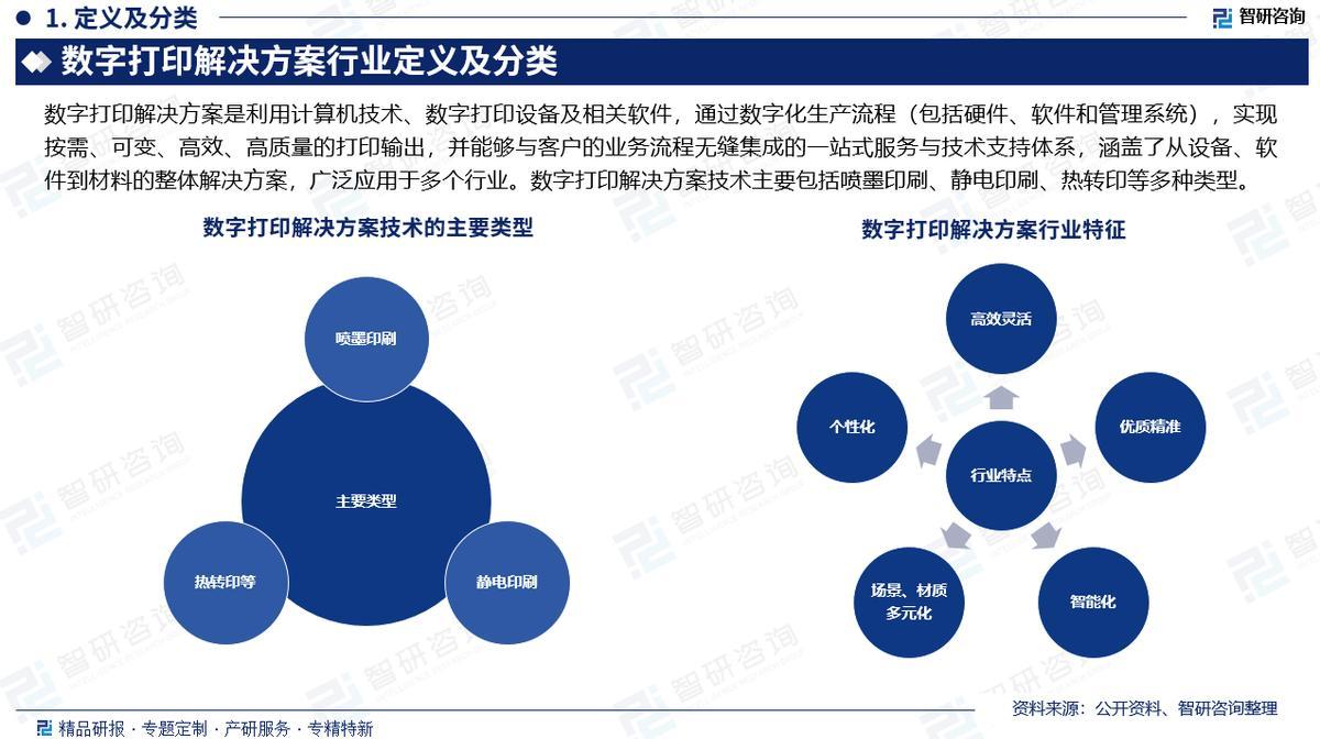 行业定义及分类:数字打印解决方案是利用计算机技术、数字打印设备及相关软件,通过数字化生产流程(包括硬件、软件和管理系统),实现按需、可变、高效、高质量的打印输出,并能够与客户的业务流程无缝集成的一站式服务与技术支持体系,涵盖了从设备、软件到材料的整体解决方案,广泛应用于多个行业。数字打印解决方案技术主要包括喷墨印刷、静电印刷、热转印等多种类型。