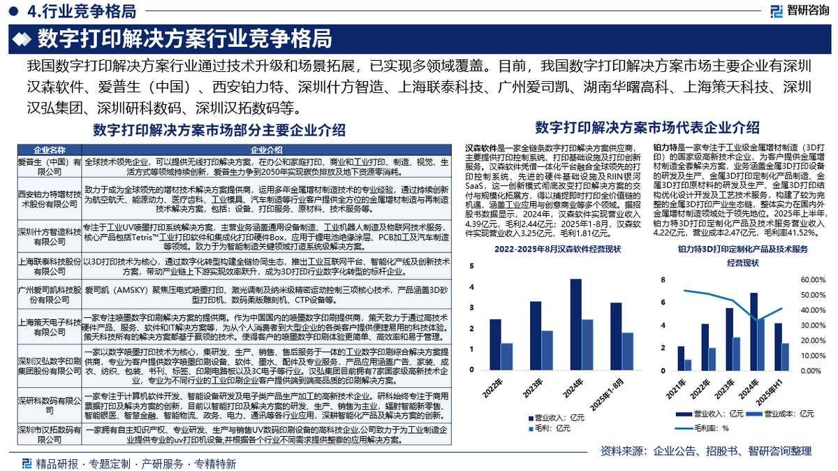 龙头企业:我国数字打印解决方案行业通过技术升级和场景拓展,已实现多领域覆盖。目前,我国数字打印解决方案市场主要企业有深圳汉森软件、爱普生(中国)、西安铂力特、深圳什方智造、上海联泰科技、广州爱司凯、湖南华曙高科、上海策天科技、深圳汉弘集团、深圳研科数码、深圳汉拓数码等。