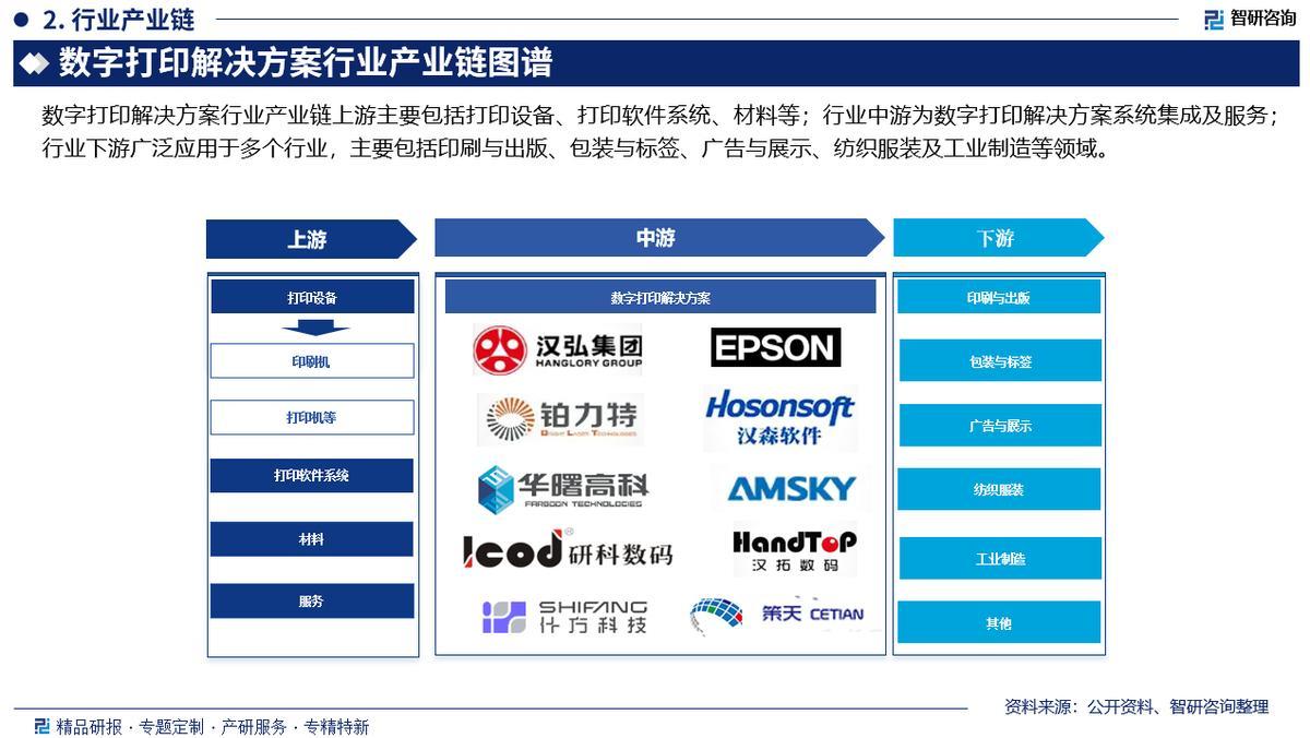 产业链核心节点:数字打印解决方案行业产业链上游主要包括打印设备、打印软件系统、材料等;行业中游为数字打印解决方案系统集成及服务;行业下游广泛应用于多个行业,主要包括印刷与出版、包装与标签、广告与展示、纺织服装及工业制造等领域。