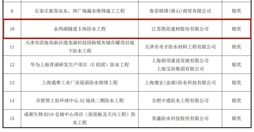 其中,凯伦股份(维权)凭借“金鸡湖隧道主体防水工程”案例斩获工程技术奖银奖一枚,再次有力彰显融合防水系统的卓越品质。