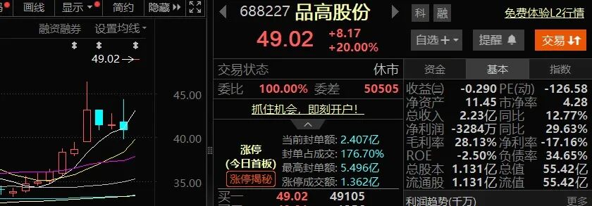 11月21日,品高股份股票开盘涨停20%封板,直至收盘未开板,总市值55.42亿元。