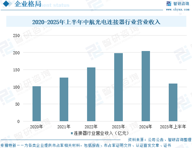 中航光电科技股份有限公司专业从事中高端光、电、流体连接技术与产品的研究与开发,专业为航空及防务和高端制造提供互连方案,自主研发各类连接产品500多个系列、35万多个品种,主要产品包括光、电、流体连接器,光电子器件,线缆组件及集成化设备,广泛应用于防务、商业航空航天、通信网络、数据中心、石油装备、电力装备、工业装备、轨道交通、医疗设备、新能源汽车、消费电子等高端制造领域。公司深耕连接器行业50余年,致力于成为“全球一流的互连方案提供商”,树立了“专业、可靠、高端”的品牌形象,以清晰的品牌定位及多元化的营销渠道,着力提升品牌价值,塑造卓越品牌形象,加速品牌国际化进程,持续扩大品牌影响力。公司拥有国家认可(CNAS)试验室及行业先进的试验检测平台,构建了“一次做好、零缺陷”为核心的全价值链质量管理模式,系统规划质量发展,建立适应不同领域的质量管理体系,已通过GB/T19001和GJB9001C标准的质量管理体系认证、AS9100D国际航空航天质量管理体系认证、IATF16949汽车行业质量管理体系认证、ISO22163轨道交通业质量管理体系认证、IS013485医疗器械质量管理体系认证、NADCAP热处理/化学处理/无损检测特种工艺认证等,并选择代表性产品先后通过了UL、CUL、CE、TUV、CB、3C、CQC、IECEX、ATEX等安规认证,为质量管理体系建设与发展提供全面的制度文件和流程保障。数据显示,2025年上半年,中航光电连接器行业营业收入为109.34亿元,同比增长21.57%。