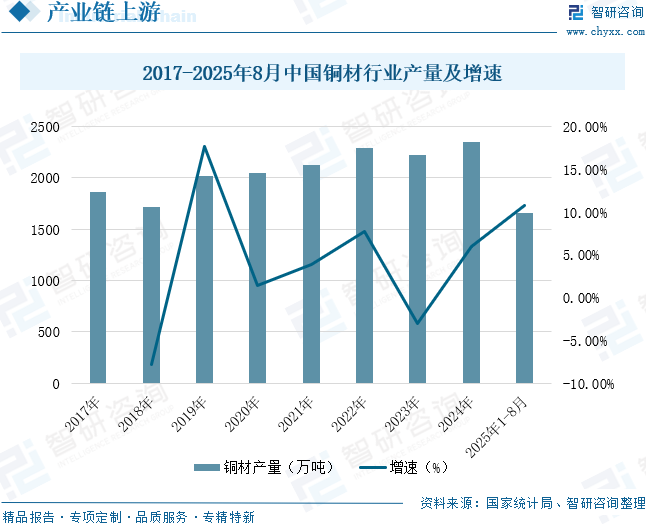 铜材凭借其优异的导电性、导热性及良好的力学性能,成为制造工业连接器导电端子等核心部件的关键材料。近年来,在电力电网、家电设备等传统领域需求保持稳定的支撑下,铜材行业奠定了坚实的产量基础。与此同时,新能源汽车、光伏储能、特高压建设及5G通信等新兴领域的蓬勃发展,对高性能、特种铜材形成了显著拉动,成为推动产量增长的重要动力。在国家“双碳”战略引导与全球能源结构转型的背景下,铜材作为能源传输与电子信息产业不可或缺的基础材料,其市场需求空间持续拓宽。国家统计局数据显示,中国铜材行业产量从2017年的1861.7万吨增长至2024年的2350.3万吨,年复合增长率为3.39%。2025年1-8月,中国铜材行业产量为1659.8万吨,同比增长10.7%。未来,随着铜材产量的持续增长和材料性能的不断优化,将为工业连接器等下游行业提供更充足的原料保障和更广阔的技术升级空间。
