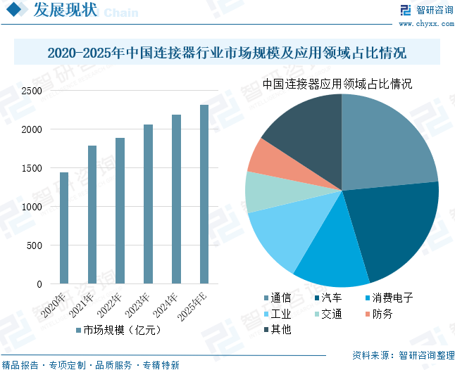 连接器作为实现电力与电气信号连接的核心电子部件,在现代高速电子产品设计中具有至关重要的桥梁作用。它通过导体与配对元件的有效连接,控制电流或信号的接通与断开,从而在器件、组件与系统之间建立起稳定可靠的能量传输与信号交互通道。近年来,随着下游应用领域的持续拓展与连接器技术自身的迭代升级,连接器已成为保障设备内部能量与信息稳定流通的关键基础元件,市场规模也呈现逐年增长的态势。数据显示,中国连接器行业市场规模从2020年的1438亿元增长至2024年的2181亿元,年复合增长率为10.97%。预计2025年中国连接器行业市场规模将增至2312亿元。从应用领域来看,作为复杂产品模块化设计不可或缺的组成部分,连接器已广泛应用于通信、汽车、消费电子、工业制造、交通运输及国防等多个重要领域,并逐步发展成为电子信息制造业中的关键电子元器件产业。其中,通信领域占据最大市场份额,占比达23.47%,其次是汽车、消费电子和工业,占比分别为21.86%、13.13%、12.8%。