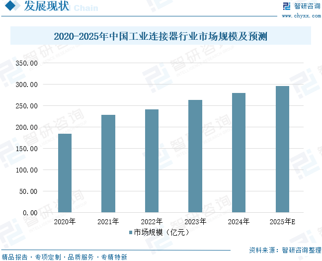 近年来,随着工业4.0、智能制造2025的深入推进,以及数字化、智能化与信息化技术的迅猛发展,工业连接器的应用愈发广泛,扮演着举足轻重的角色。工业连接器专为复杂工业环境和户外环境等多样化应用场景而设计,它们主要用于电气、电子设备的电缆与电缆、电缆与设备间的电路连接,旨在传输信号和电能(功率),成为各类电气、电子系统中不可或缺的关键电子元器件。数据显示,中国工业连接器行业规模呈现逐年增长的态势,市场规模从2020年的184.06亿元增长至2024年的279.17亿元,年复合增长率为11%。未来,随着工业数字化和智能化转型的持续推进,工业连接器市场规模有望继续保持增长态势,预计2025年中国工业连接器行业市场规模将增至295.94亿元。