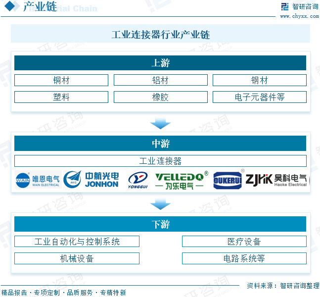 工业连接器产业链上游为原材料和零部件,包括铜材、铝材、钢材、塑料、橡胶、有色金属、电子元器件等。产业链中游为工业连接器的生产制造环节。产业链下游为应用领域,包括工业自动化与控制系统、医疗设备、机械设备、电路系统等。