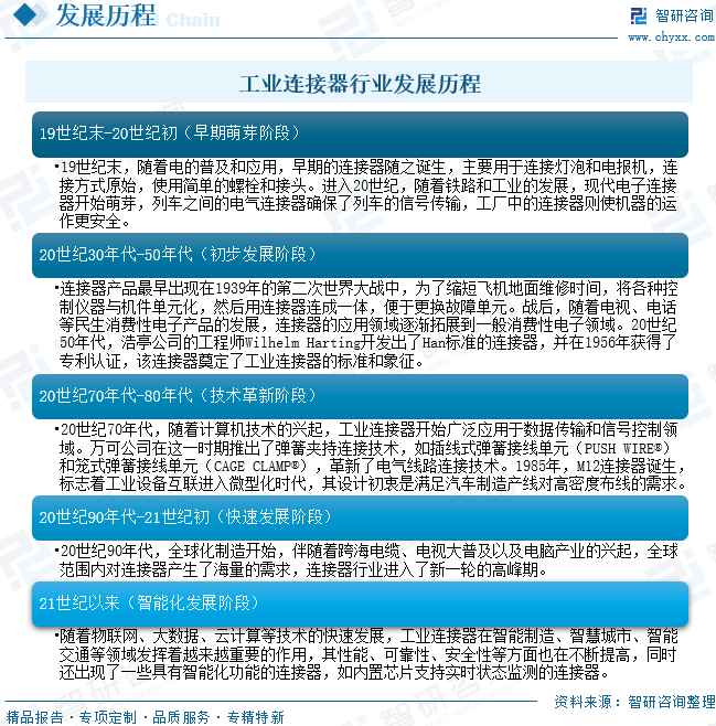 工业连接器行业的发展经历了五个阶段,分别是19世纪末到20世纪初的早期萌芽阶段、20世纪30年代至50年代的初步发展阶段、20世纪70年代至80年代的技术革新阶段、20世纪90年代至21世纪初的快速发展阶段以及21世纪以来的智能化发展阶段。