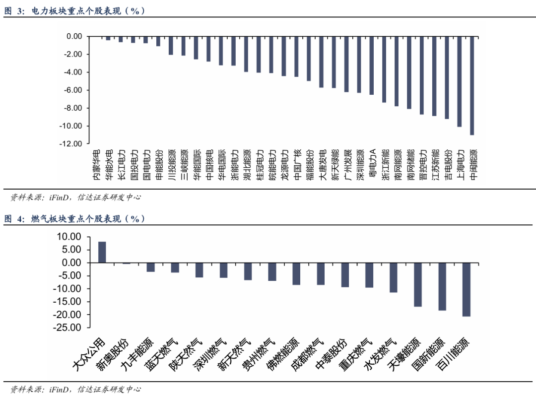 截至11月21日收盘,本周电力板块主要公司涨跌幅前三名分别为:内蒙华电(0.00%)、华能水电(-0.42%)、长江电力(-0.64%),主要公司涨跌幅后三名分别为:中闽能源(-11.04%)、上海电力(-10.11%)、吉电股份(-9.24%);本周燃气板块主要公司涨跌幅前三名分别为:大众公用(8.10%)、新奥股份(-0.34%)、九丰能源(-3.43%),主要公司涨跌幅后三名分别为:百川能源(-20.63%)、国新能源(-18.36%)、天壕能源(-16.94%)。