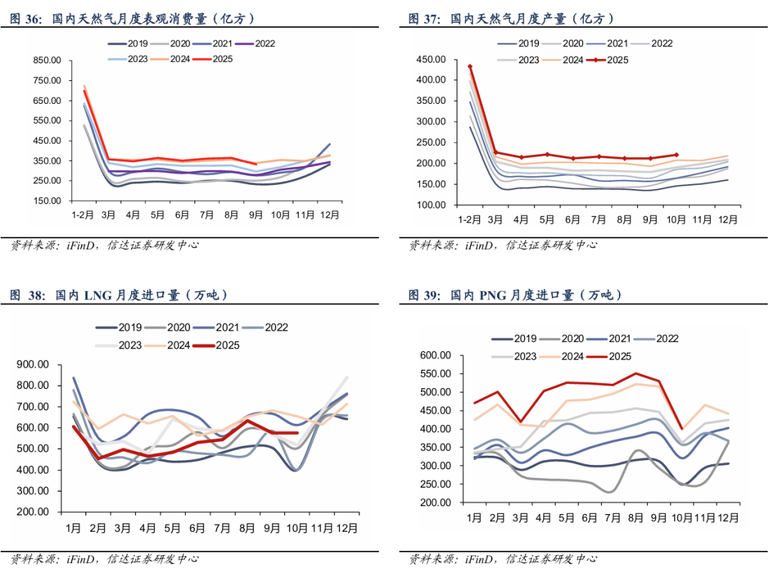 2025年1-10月,国内天然气产量累计为2170.50亿方,累计同比上升6.5%。2025年1-10月,LNG进口量累计为5315.00万吨,累计同比下降16.4%。2025年1-10月,PNG进口量累计为4945.00万吨,累计同比上升7.5%。