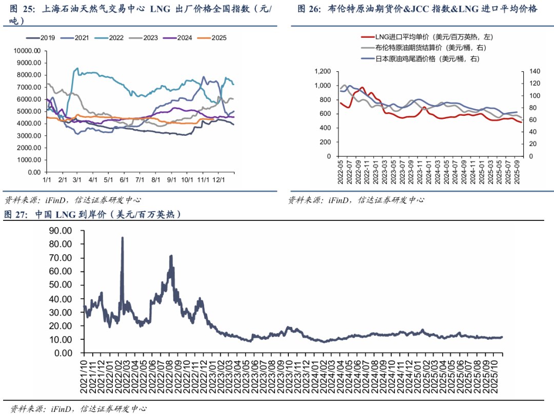 ⚫ 国产LNG价格周环比下跌,进口LNG价格周环比上涨:截至11月21日,上海石油天然气交易中心LNG出厂价格全国指数为4351元/吨(约合3.11元/方),同比下降4.08%,环比下降0.14%;2025年9月,国内LNG进口平均价格为480.51美元/吨(约合2.44元/方),同比下降17.99%,环比下降4.09%。截至11月20日,中国进口LNG到岸价为11.67美元/百万英热(约合3.04元/方),同比下降25.14%,环比上升6.08%。