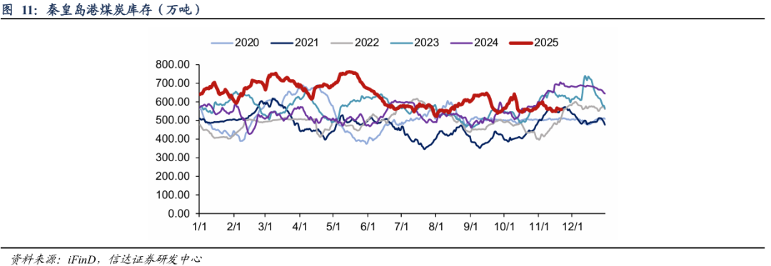⚫港口煤炭库存:截至11月21日,秦皇岛港煤炭库存560万吨,周环比增加10万吨。
