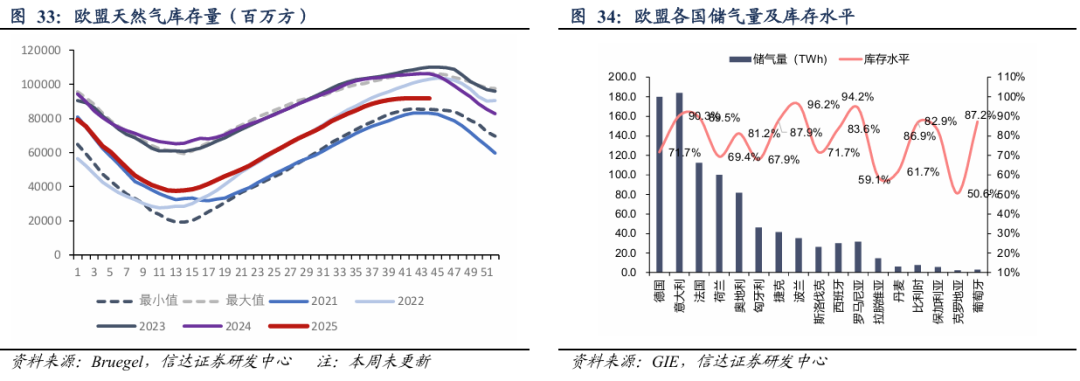 欧盟天然气供需及库存:2025年第44周,欧盟天然气供应量65.0亿方,同比上升14.4%,周环比上升5.9%。其中,LNG供应量为30.2亿方,周环比上升9.3%,占天然气供应量的50.6%;进口管道气34.8亿方,同比下降2.6%,周环比上升3.1%。2025年第44周,欧盟天然气消费量(我们估算)为64.9亿方,周环比上升5.2%,同比上升13.2%;2025年1-44周,欧盟天然气累计消费量(我们估算)为2542.5亿方,同比上升6.4%。