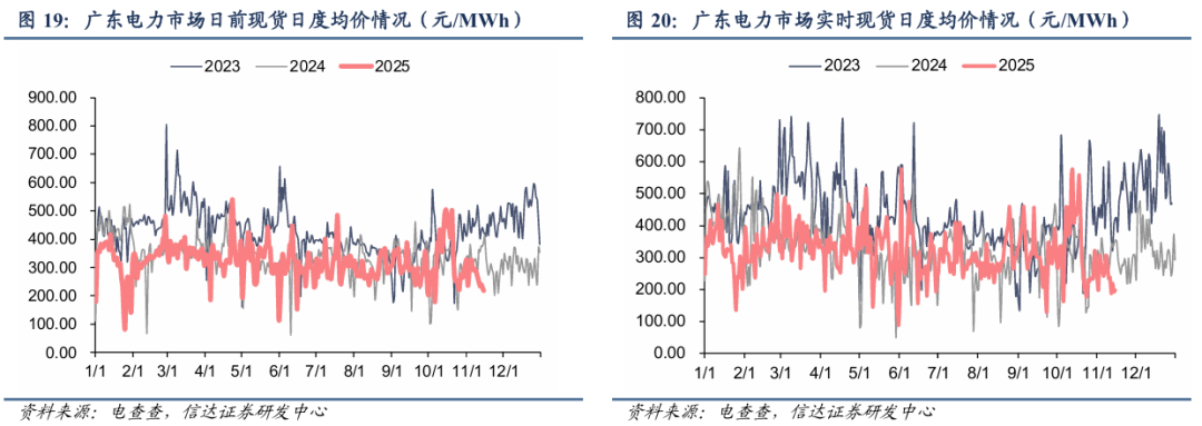 ⚫ 广东实时现货市场:截至11月15日,广东电力实时现货市场的周度均价为219.78元/MWh,周环比下降17.36%,周同比下降31.9%。