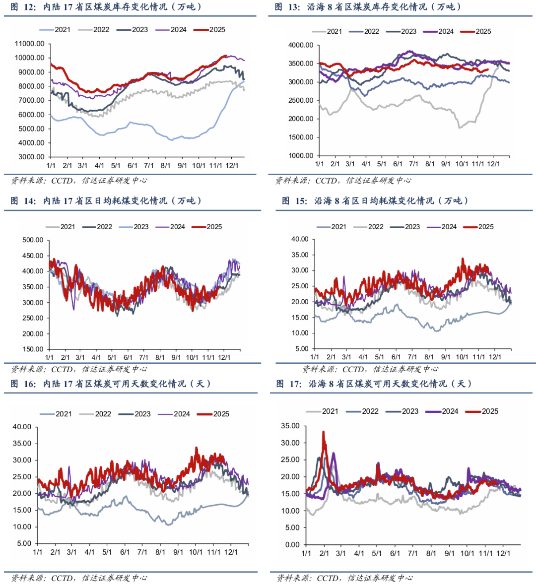⚫内陆17省电厂库存、日耗及可用天数:截至11月20日,内陆17省煤炭库存10151.7万吨,较上周增加89.1万吨,周环比上升0.89%;内陆17省电厂日耗为351.1万吨,较上周增加14.7万吨/日,周环比上升4.37%;可用天数为28.91天,较上周下降1.0天。