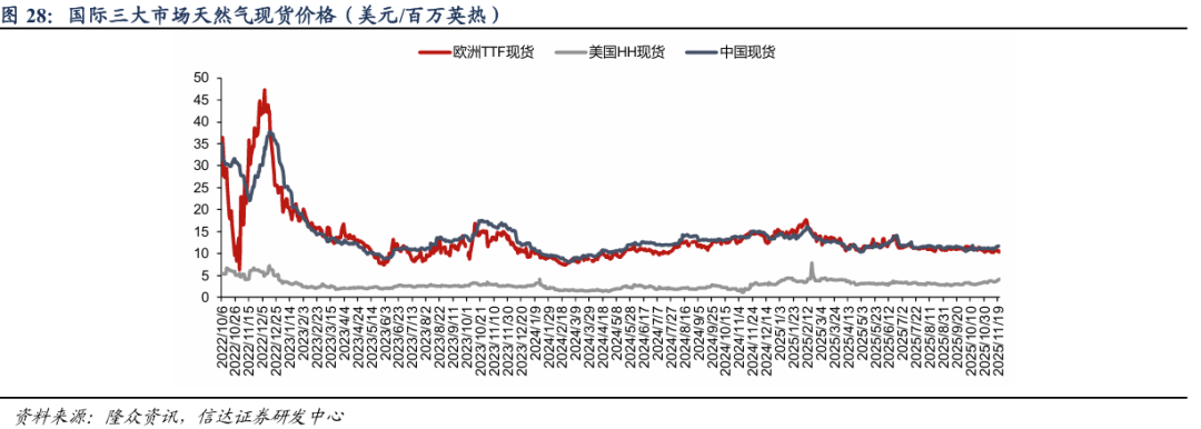 截至11月20日,欧洲TTF现货价格为10.62美元/百万英热,同比下降26.1%,周环比上升4.0%;美国HH现货价格为3.98美元/百万英热,同比上升89.5%,周环比上升11.2%;中国DES现货价格为11.67美元/百万英热,同比下降18.1%,周环比上升6.1%。