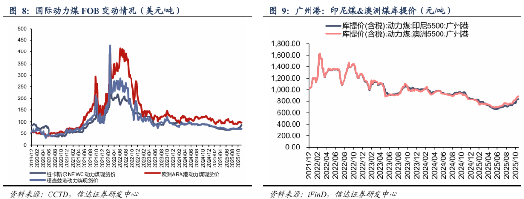 ● 海外动力煤价格:截至11月20日,纽卡斯尔NEWC5500大卡动力煤FOB现货价格86.5美元/吨,周环比上涨4.00美元/吨;ARA6000大卡动力煤现货价94.8美元/吨,周环比上涨0.05美元/吨;理查兹港动力煤FOB现货价70.05美元/吨,周环比上涨1.05美元/吨。截至11月21日,纽卡斯尔NEWC指数价格107.77美元/吨,周环比下跌0.5美元/吨。截至11月21日,广州港印尼煤(Q5500)库提价841.13元/吨,周环比上涨10.75元/吨;广州港澳洲煤(Q5500)库提价889.28元/吨,周环比上涨11.63元/吨。