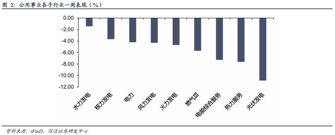 截至11月21日收盘,本周公用事业板块下跌4.3%,表现劣于大盘。其中,电力板块下跌4.19%,燃气板块下跌5.70%。