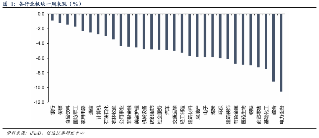 截至11月21日收盘,本周公用事业板块下跌4.3%,表现劣于大盘;沪深300下跌3.8%到4453.61;涨跌幅前三的行业分别是银行(-0.9%)、传媒(-1.3%)、食品饮料(-1.4%),涨跌幅后三的行业分别是电力设备(-10.5%)、综合(-9.2%)、基础化工(-7.5%)。