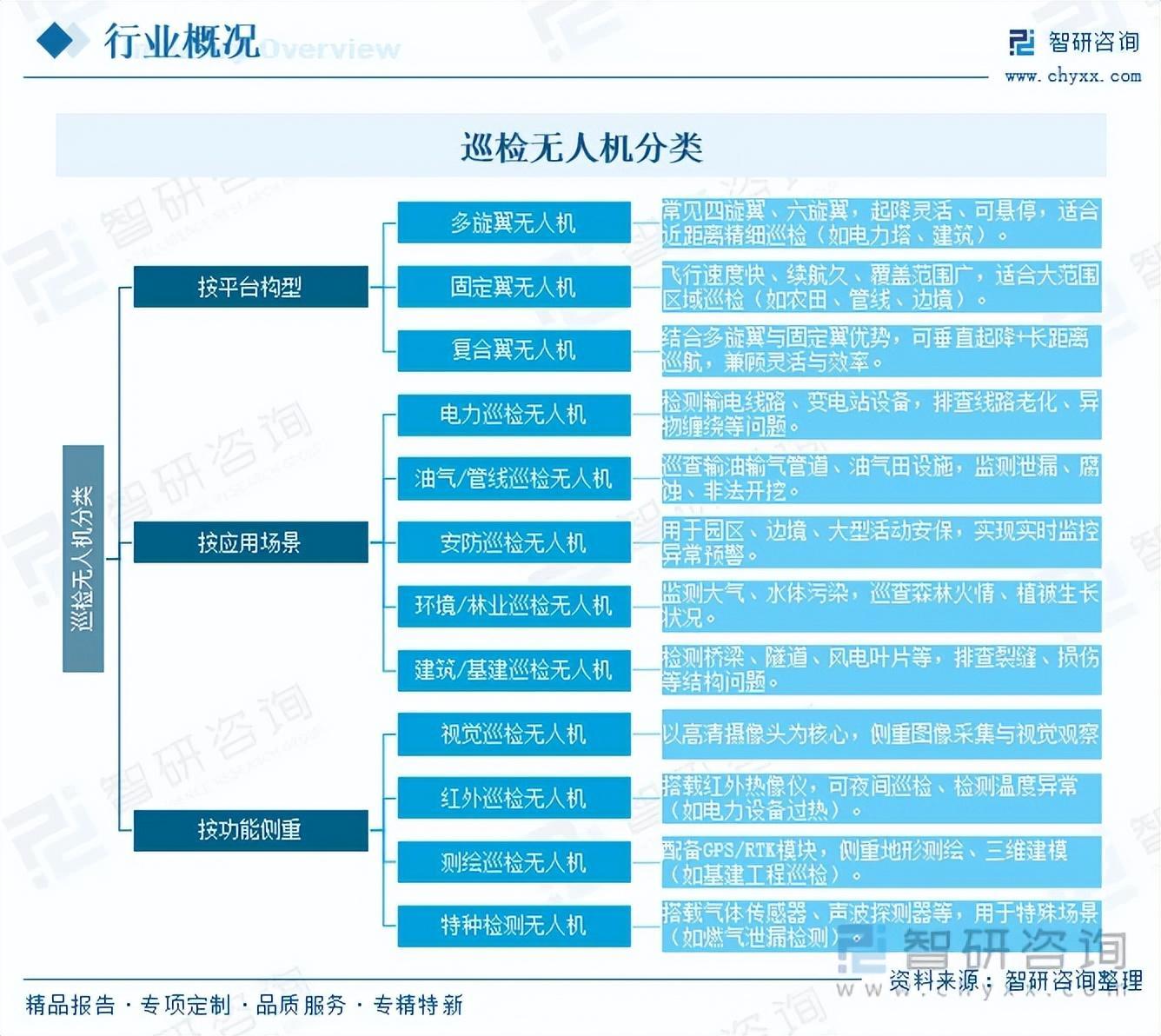 按平台构型不同,巡检无人机可以分为多旋翼无人机、固定翼无人机、复合翼无人机等类型;按应用场景不同,巡检无人机可以分为电力巡检无人机、油气/管线巡检无人机、安防巡检无人机、环境/林业巡检无人机、建筑/基建巡检无人机等类型;按功能侧重不同,巡检无人机可以分为视觉巡检无人机、红外巡检无人机、测绘巡检无人机、特种检测无人机等类型。
