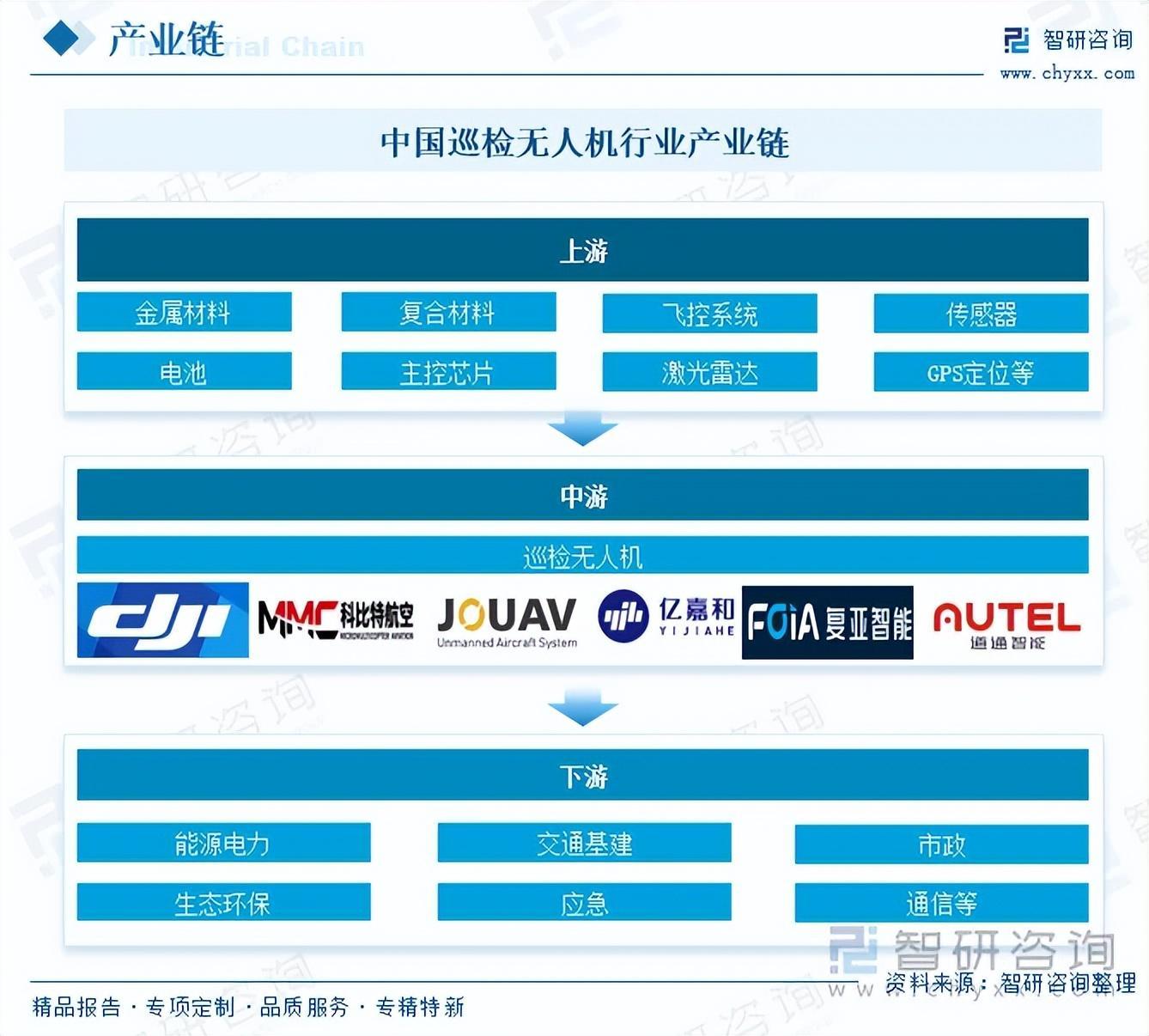 巡检无人机行业上游主要包括钢材、铝合金、钛合金等金属材料供应商,树脂基、陶瓷基、金属基等复合材料供应商,飞控系统、传感器、电池、主控芯片等核心零部件供应商以及区块链、人工智能、VR/AR、遥感、激光雷达、GPS定位等信息技术服务提供商;行业中游为巡检无人机研发、设计、生产等环节;行业下游为应用市场,涵盖能源电力、交通基建、市政、生态环保、应急、通信等诸多领域。